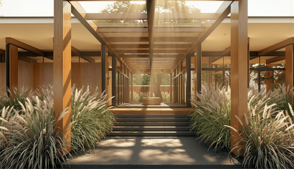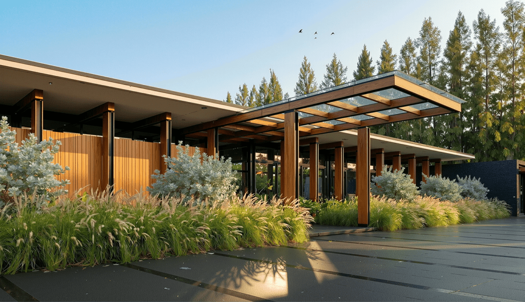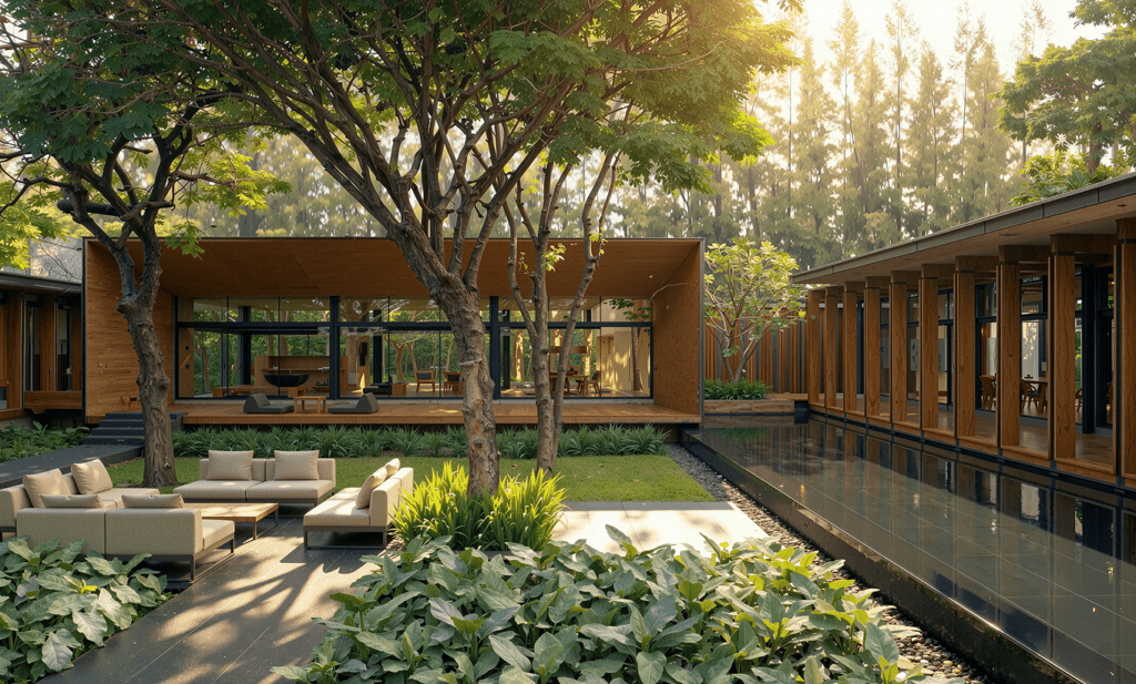 A LOW, ELONGATED PAVILION THAT LIVES WITH THE GARDEN, NOT ABOVE IT. CLEAN LINES AND DEEP EAVES CAST SOFT, SHIFTING SHADOWS ALL DAY. WARM TIMBER AND CLEAR GLAZING CREATE AN HONEST, INVITING CHARACTER. LARGE OPENINGS DISSOLVE THE BOUNDARY BETWEEN INDOORS AND OUTDOORS. A LINEAR REFLECTING POOL MIRRORS THE HOUSE AND GREENERY, ENHANCING SERENITY.